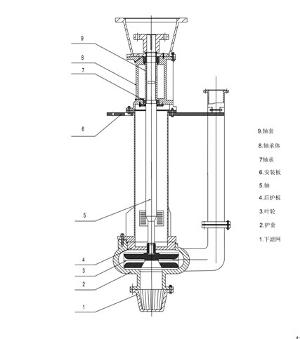 ZJL型液下渣漿泵 立式液下渣漿泵由石家莊天工泵業(yè)有限公司生產(chǎn)。ZJL液下渣漿泵主要由葉輪、護套、后護板、軸套、支架、支撐板、軸、軸承、軸承體等零件組成。葉輪、護套、后護板的材質(zhì)為高鉻合金鑄鐵,葉輪與軸采用螺紋聯(lián)接,護套、支架、軸承體用螺栓聯(lián)接。泵軸與電機可采用聯(lián)軸器直接傳動或皮帶傳動。ZJL型渣漿泵的軸承采用油脂潤滑。該系列泵為無軸封泵。